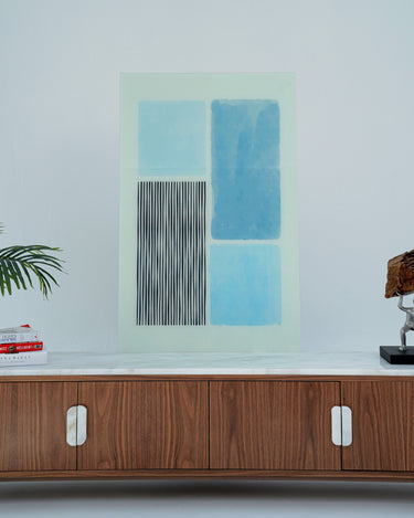 The Azure Lines Glass Artwork embodies the essence of modern restraint — a seamless dialogue between color, geometry, and transparency. Crafted on high-grade tempered glass, this piece features soothing shades of ocean blue paired with delicate vertical lines, creating a visual rhythm that evokes calm and balance.