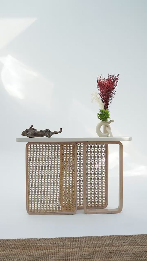 Its light, airy profile and handcrafted rattan panels add depth and texture, making the Liven Console an eye-catching statement for entryways, living rooms, hallways, and curated design corners. The soft off-white cement surface offers a refined contrast to the intricate cane weave, highlighting artisanal detail at every angle.