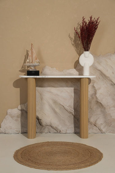 The Sora Console combines the refined beauty of Volakas marble with the natural character of solid wood, creating a harmonious balance of elegance and warmth. The marble’s soft white surface, adorned with subtle grey veining, contrasts beautifully with the wooden base, offering both visual depth and timeless sophistication.