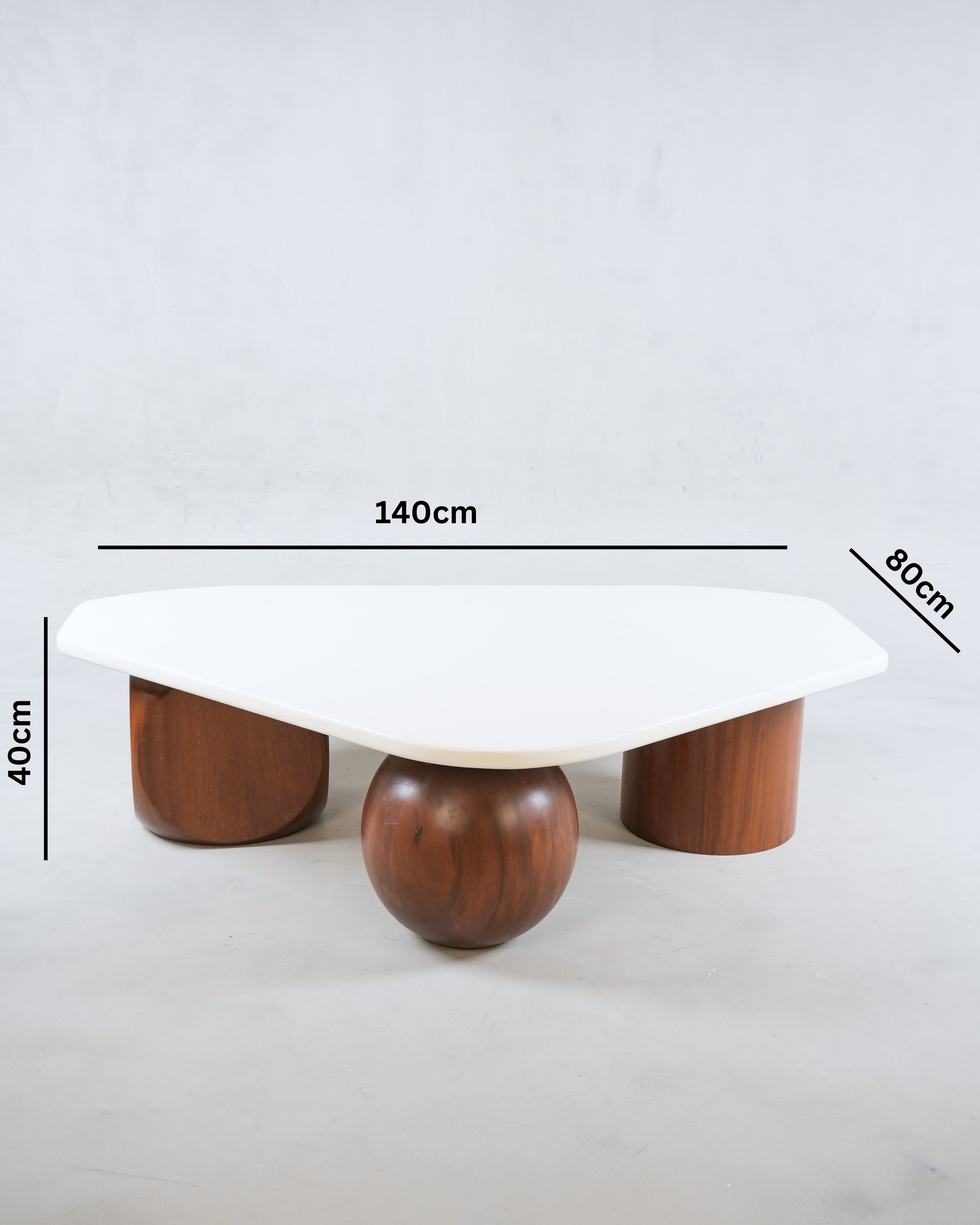 The standout feature of this table lies in its three distinct wooden bases, including a spherical central pedestal that adds balance and sculptural intrigue. Practical yet artistic, it offers ample surface space while serving as a work of art in its own right.