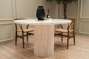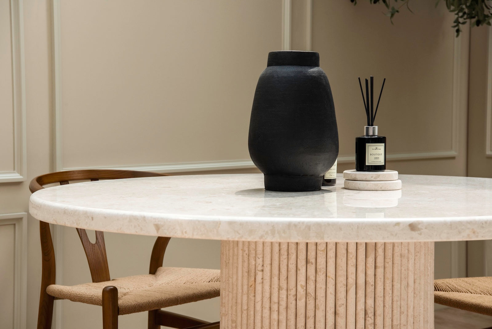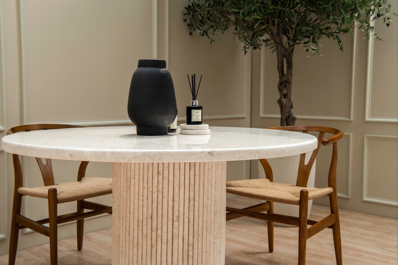 The Cela Marble Dining Table is a statement of sophistication and charm. Crafted from exquisite beige marble, its round silhouette creates a warm and inviting setting for shared meals and gatherings. With its natural stone top and carefully designed pedestal base, the Cela table brings both durability and elegance to your dining space. At D120 × H75 cm, it comfortably seats four, making it ideal for everyday dining and intimate entertaining.