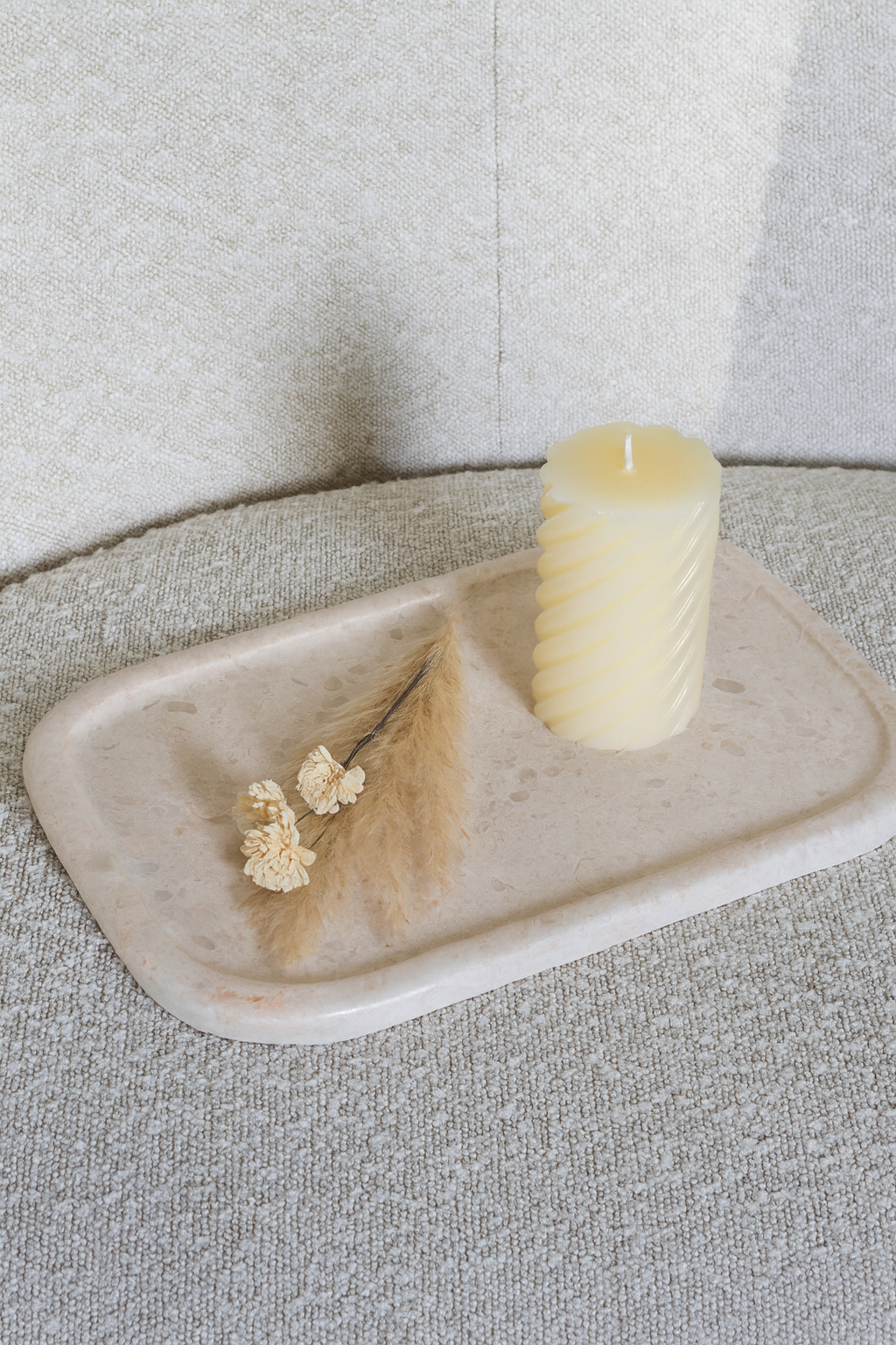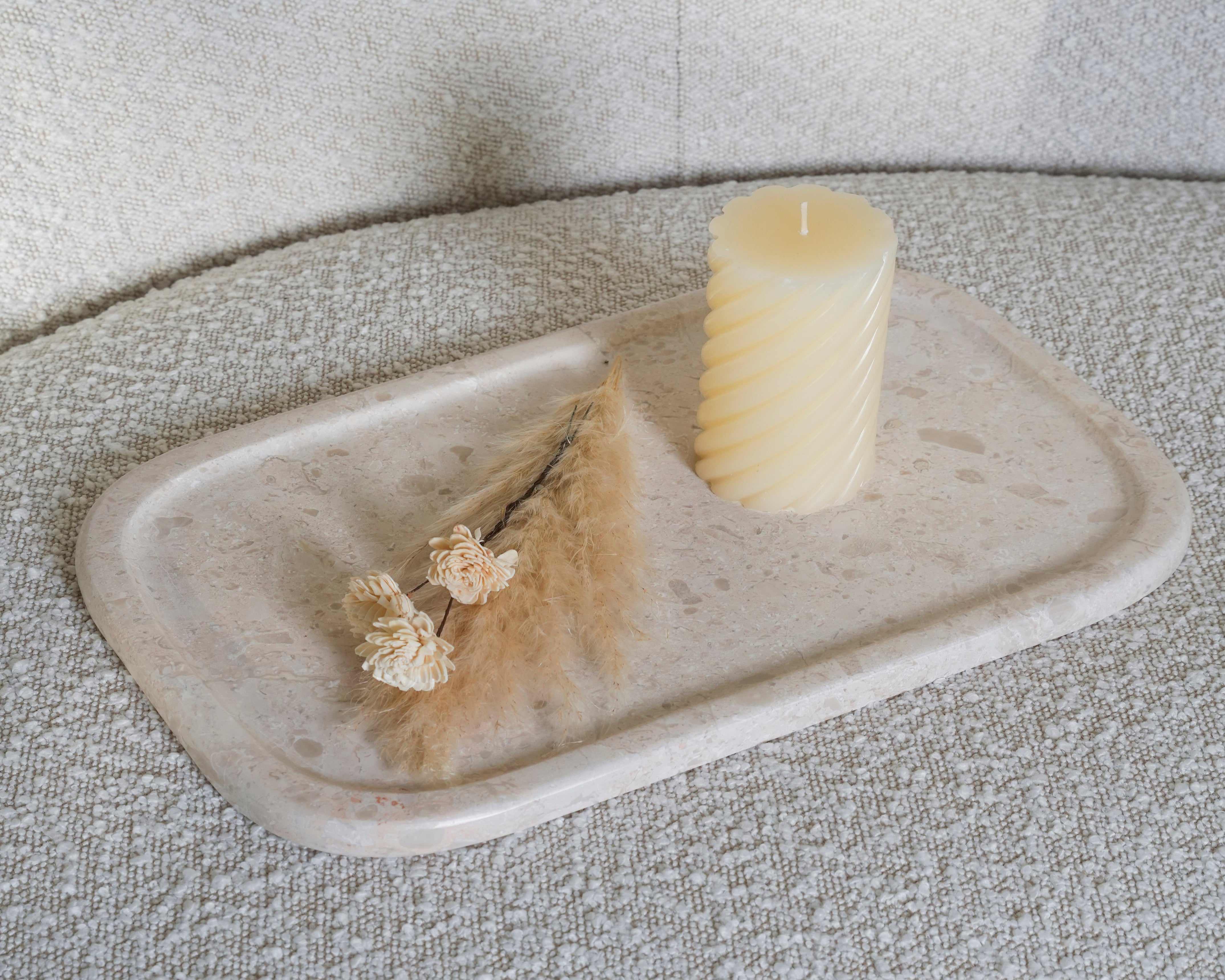The Fina Beige Marble Platter is a sophisticated serving and display piece crafted from authentic Omani beige marble. Its rectangular design, with softly rounded edges and a polished surface, adds elegance to both dining and décor. At L40 × W20 × H2 cm, it provides the perfect balance of size and versatility for presenting culinary creations, candles, or decorative accents.