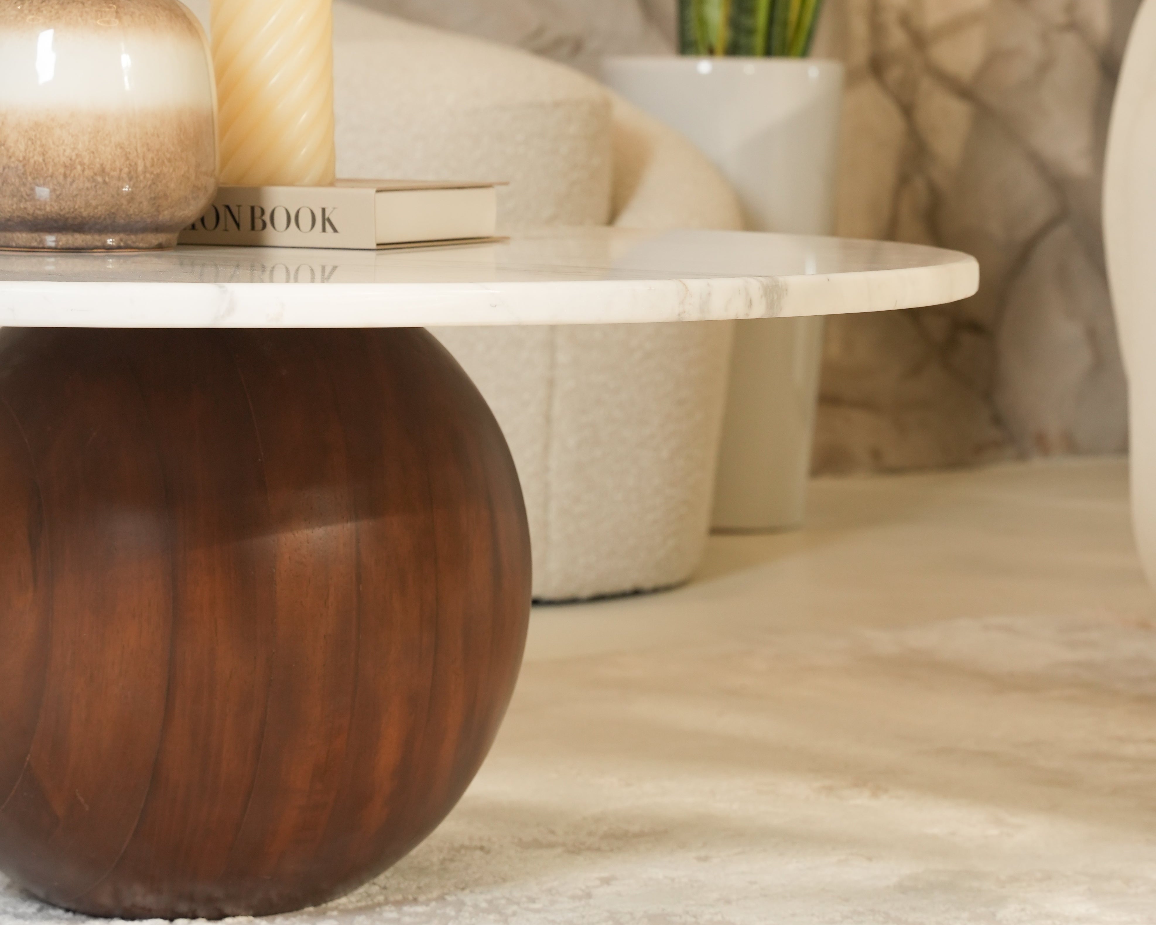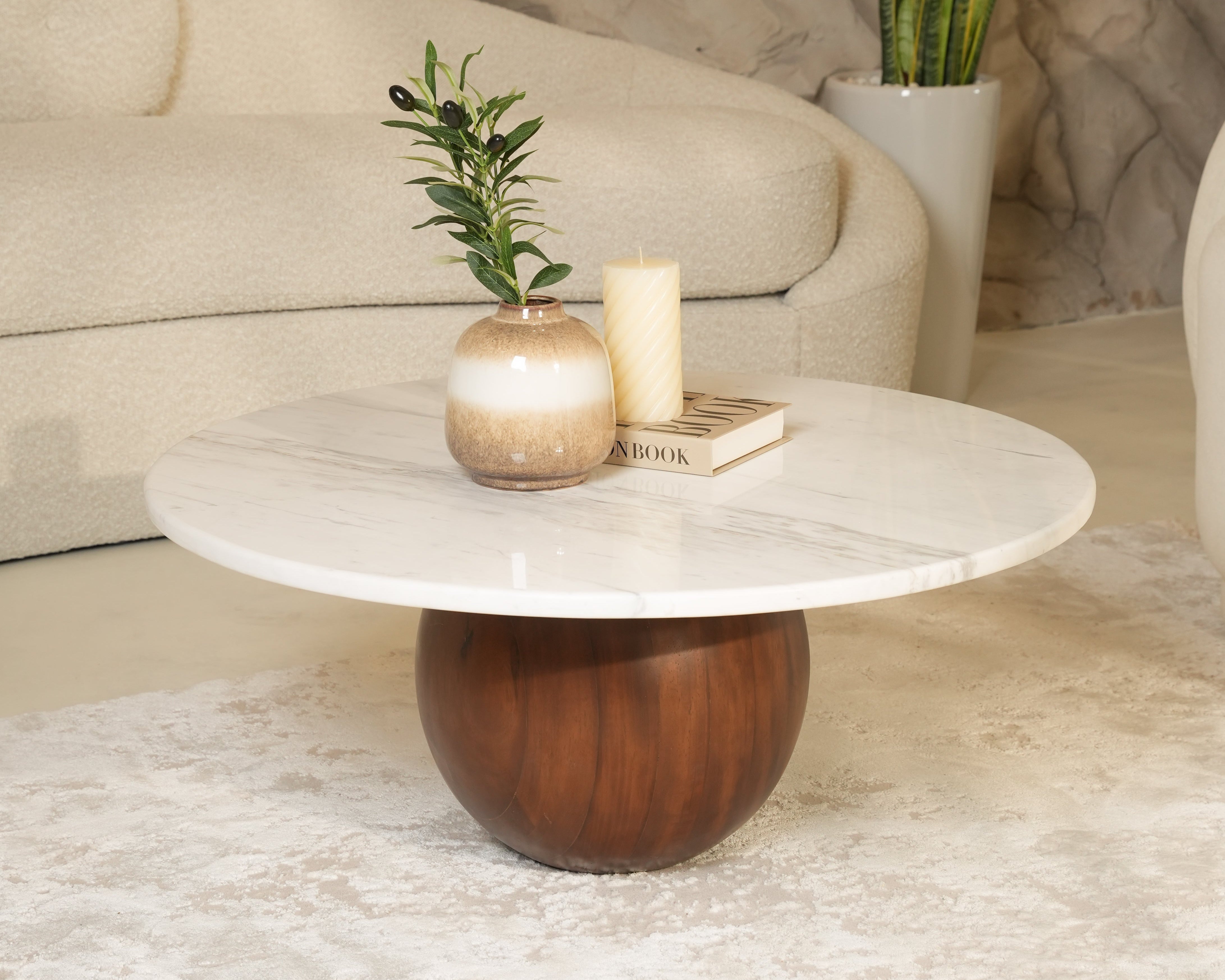 The Cala Wooden Base with Marble Coffee Table combines sculptural design with timeless materials, making it a refined centerpiece for modern living. Its smooth Volakas marble top, with a crisp white surface and delicate veining, rests on a bold rounded teak wood base that adds warmth and balance. The fusion of stone and wood creates a table that is as durable as it is elegant, designed to enhance your living space with lasting sophistication.