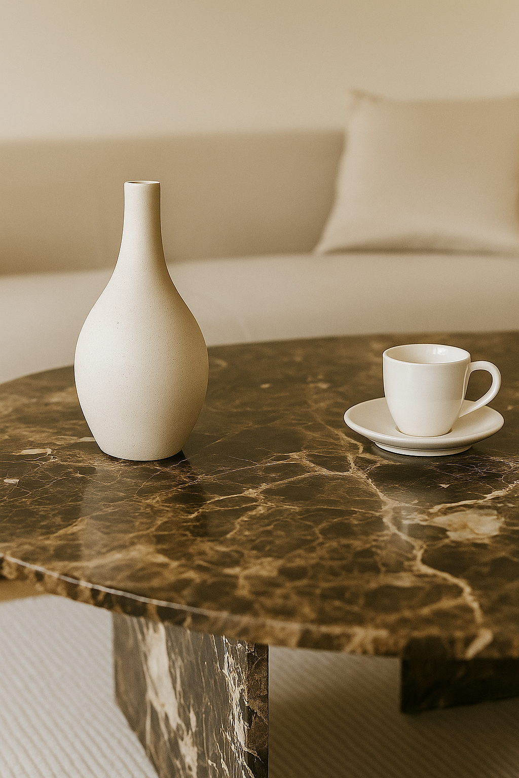 The Alviro Coffee Table is crafted from premium Brown marble, showcasing deep earthy tones with elegant natural veining. Its organic form and bold presence make it both a functional centerpiece and a work of art. With a smooth polished surface and sturdy handcrafted base, this table is designed to complement modern, classic, or eclectic interiors.