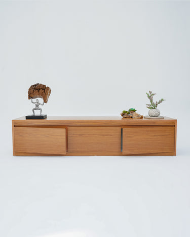 The Bero TV Unit showcases the timeless warmth and sophistication of veneered teak wood, crafted with clean lines and natural balance. Its smooth surface and subtle grain patterns bring an organic richness to your living space, while the thoughtful proportions and streamlined form embody quiet modernity.