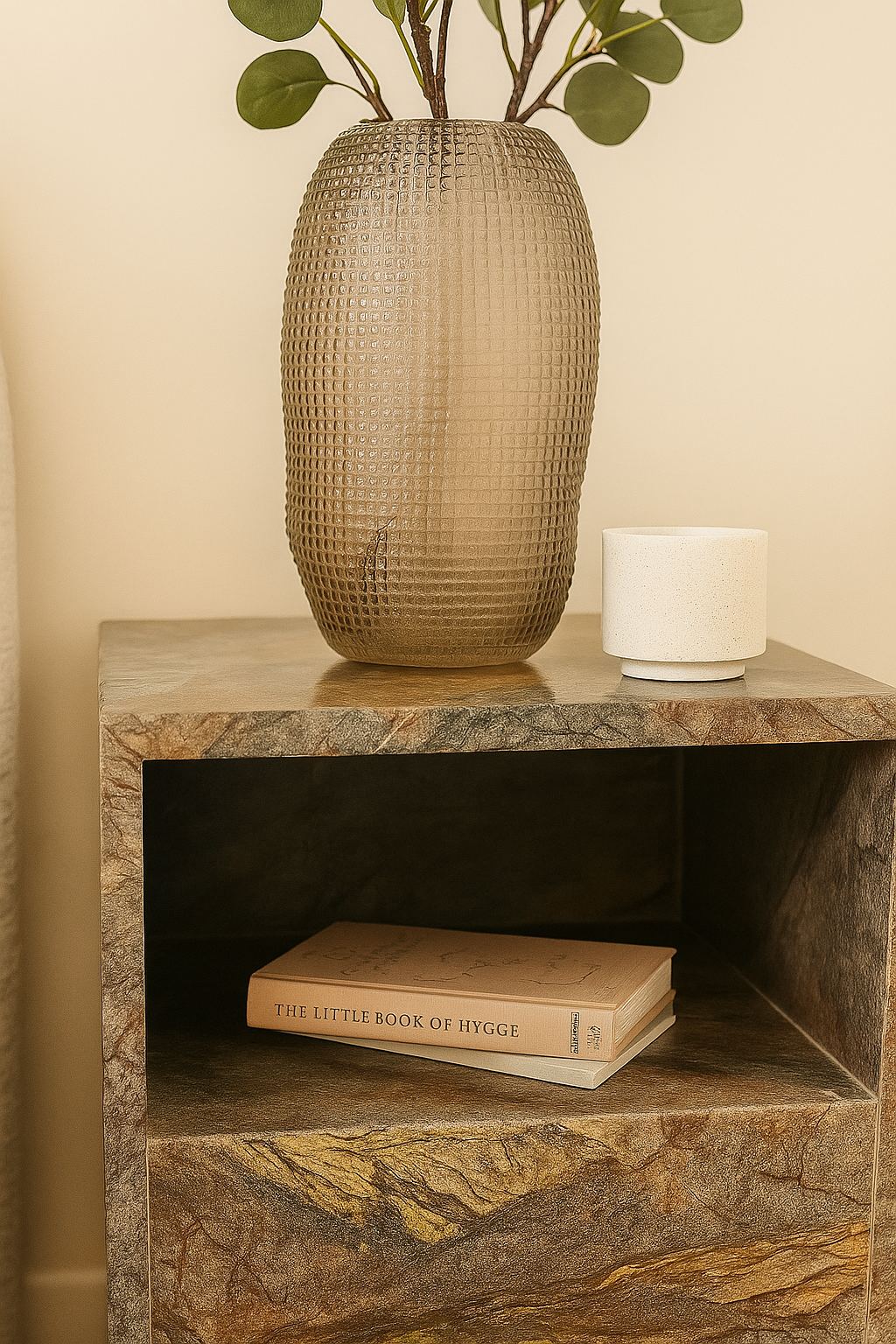 The Celoro Bedside Table is crafted from striking green marble, showcasing natural veins of earthy tones that make each piece one-of-a-kind. With its geometric structure and functional open storage space, this bedside table blends luxury with practicality. Perfect for elevating bedrooms, it serves both as a stylish accent and a functional companion.