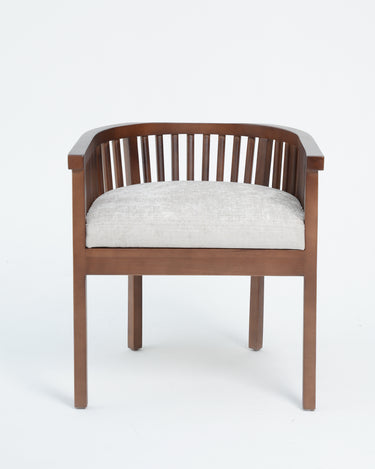 Its curved wooden backrest with vertical slats creates a light, architectural rhythm while offering supportive enclosure. The generously cushioned seat adds everyday comfort, enhanced by the soft, velvety feel of Premier Luxe Chenille. The painted beech wood structure ensures strength and longevity while maintaining a graceful, timeless profile.