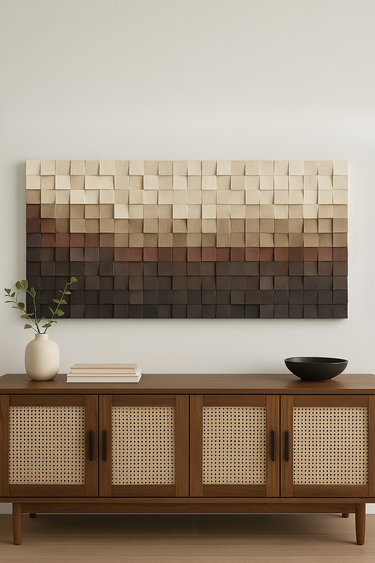 The Premium Wood Handmade Wall Sculpture XL is a stunning fusion of design, texture, and craftsmanship. Each individual wooden block is hand-cut, sanded, and placed to form a gentle gradient that moves from deep espresso tones through earthy browns to soft beige — evoking balance, calm, and timeless sophistication.