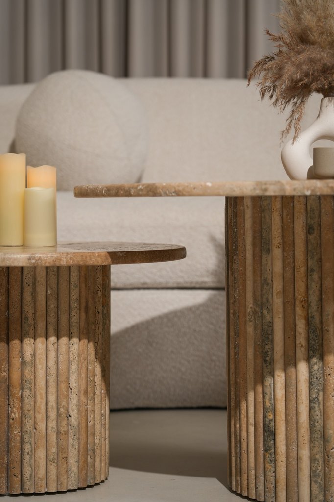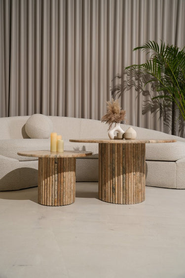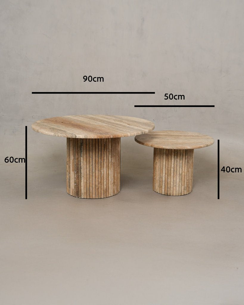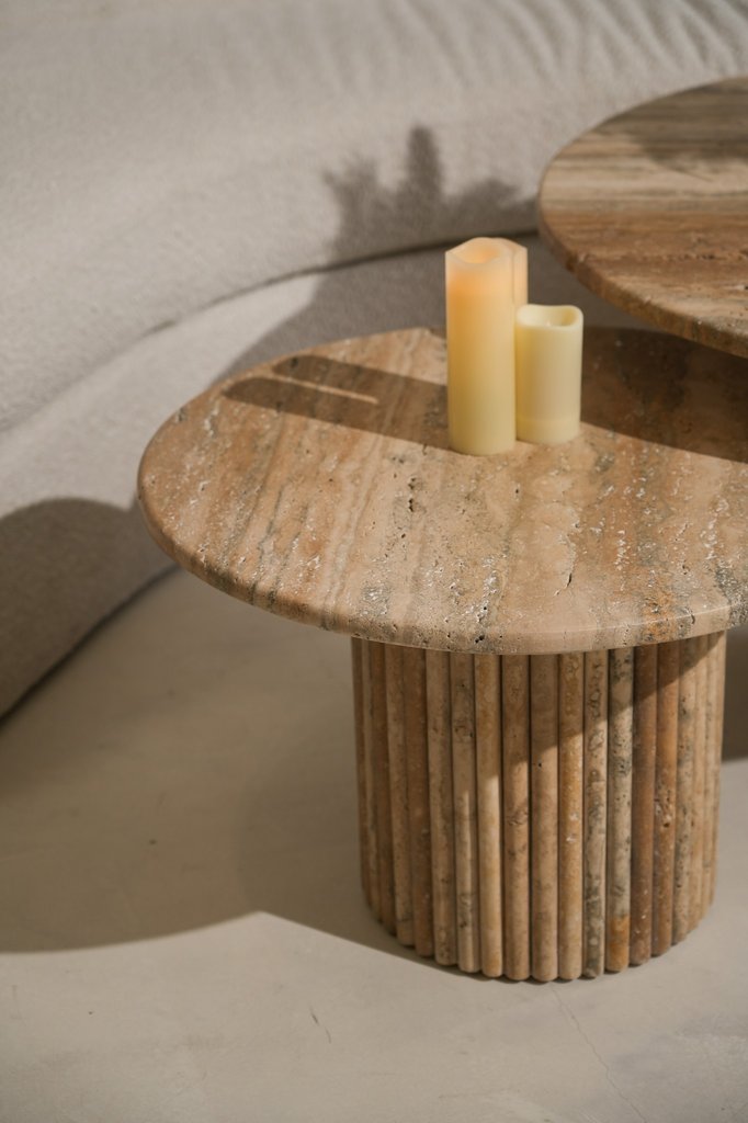 Crafted from premium travertine marble, the tables showcase subtle natural veining and earthy tones unique to each piece. The fluted cylindrical bases add depth and texture, creating a statement look that feels both modern and timeless.