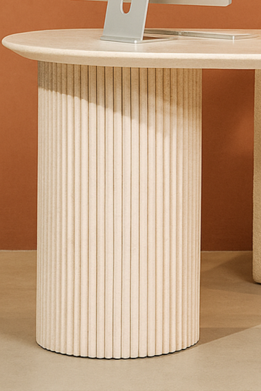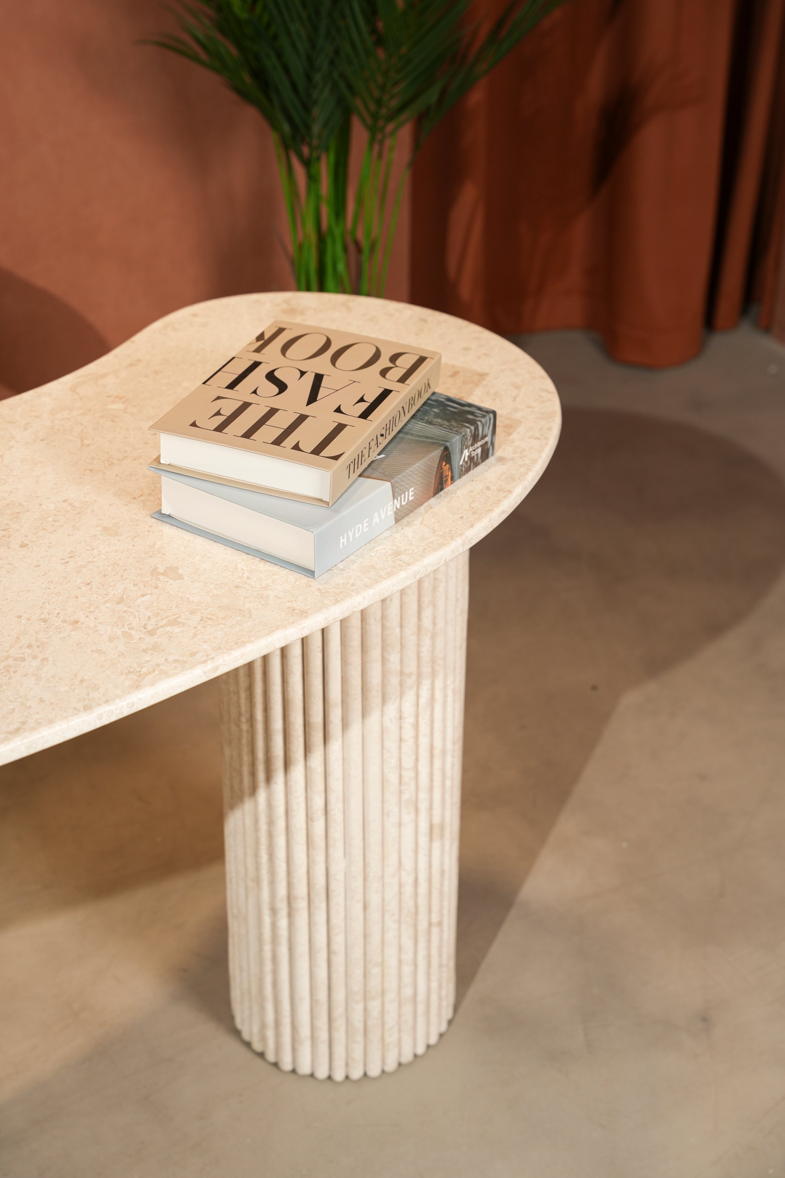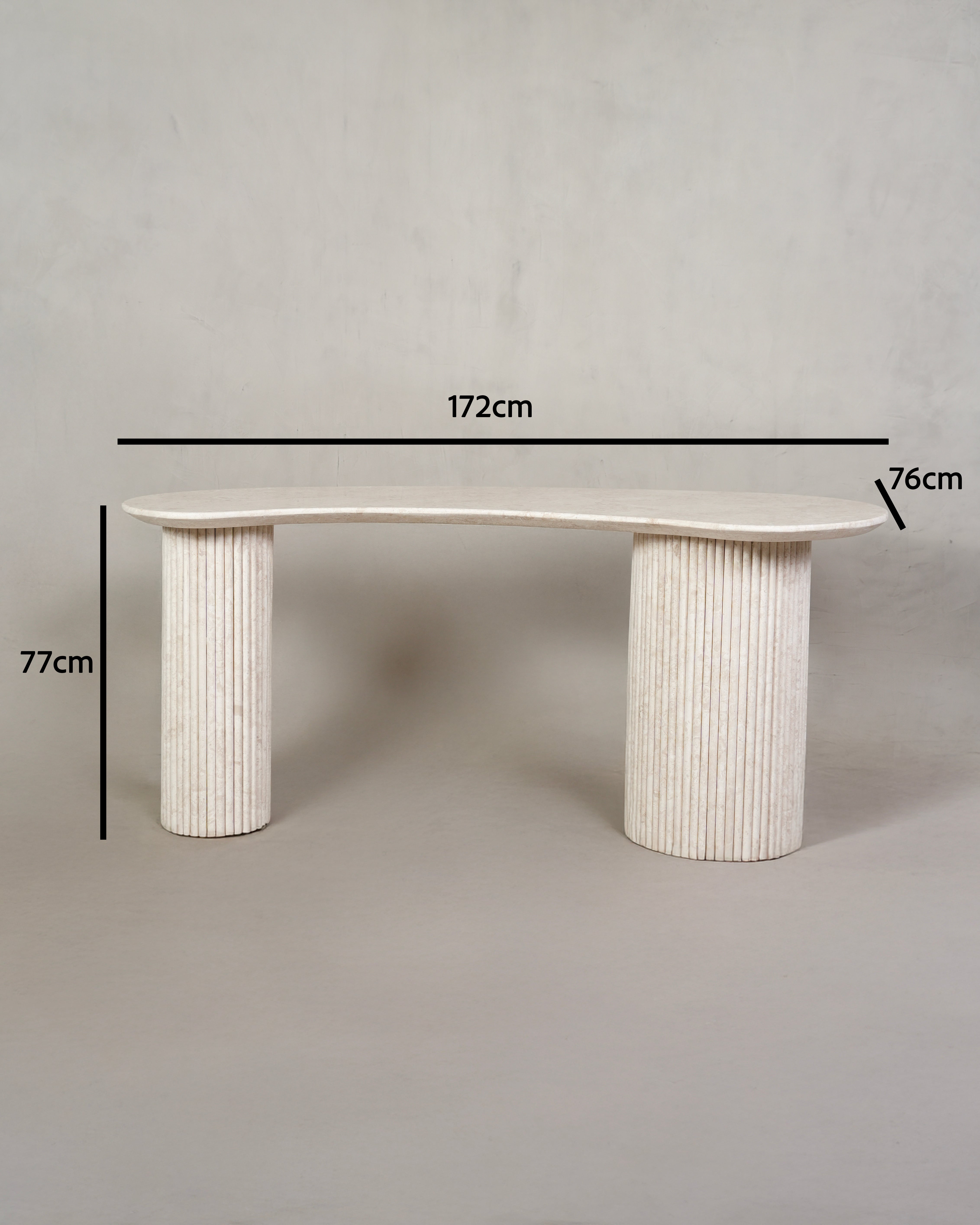 The Vellaro Desk is a striking piece crafted entirely from premium beige marble, offering both strength and sophistication. Its clean, minimal silhouette highlights the natural veining and texture of the marble, making it a timeless addition to modern workspaces, offices, or stylish interiors. Spacious and sturdy, this desk serves as a functional workstation while doubling as an elegant statement piece.