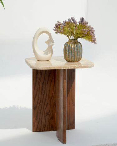 The Eral Side Table beautifully unites the organic charm of Travertine Marble Top with the rich warmth of Solid Red Oak wood Base. Its refined proportions and tactile materials create a timeless expression of balance - the cool, porous texture of stone resting effortlessly on the smooth, sculpted grain of wood.