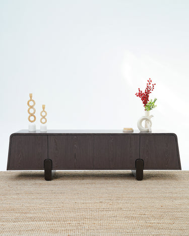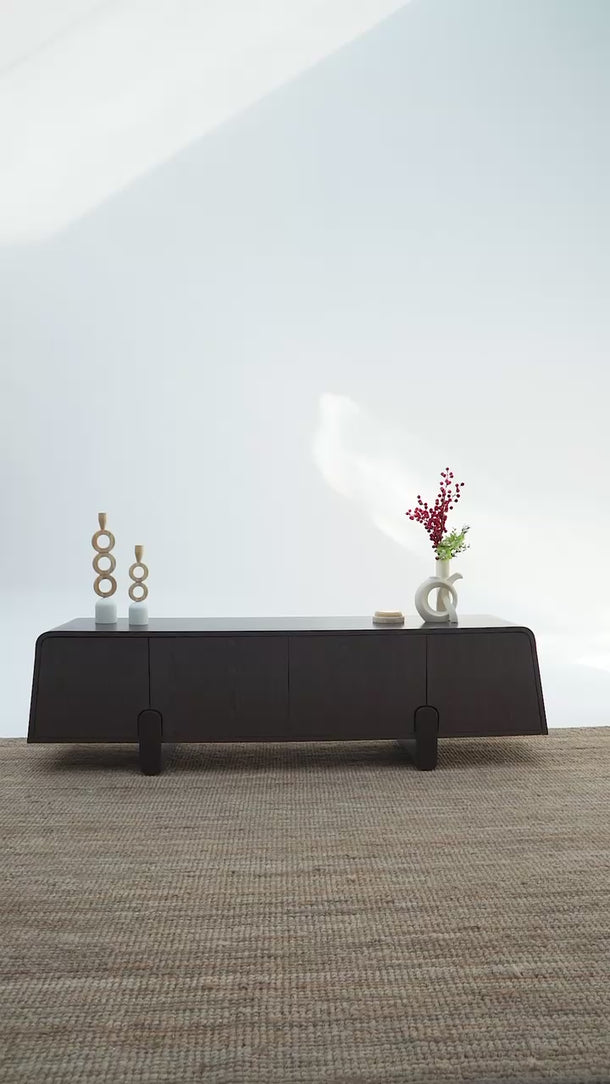 Designed with functionality and aesthetics in harmony, this piece features ample storage behind soft-close doors, making it an ideal choice for living rooms, media setups, or minimalist hallways. The curved profile and elevated base lend a sculptural balance - sleek yet grounded, refined yet warm.