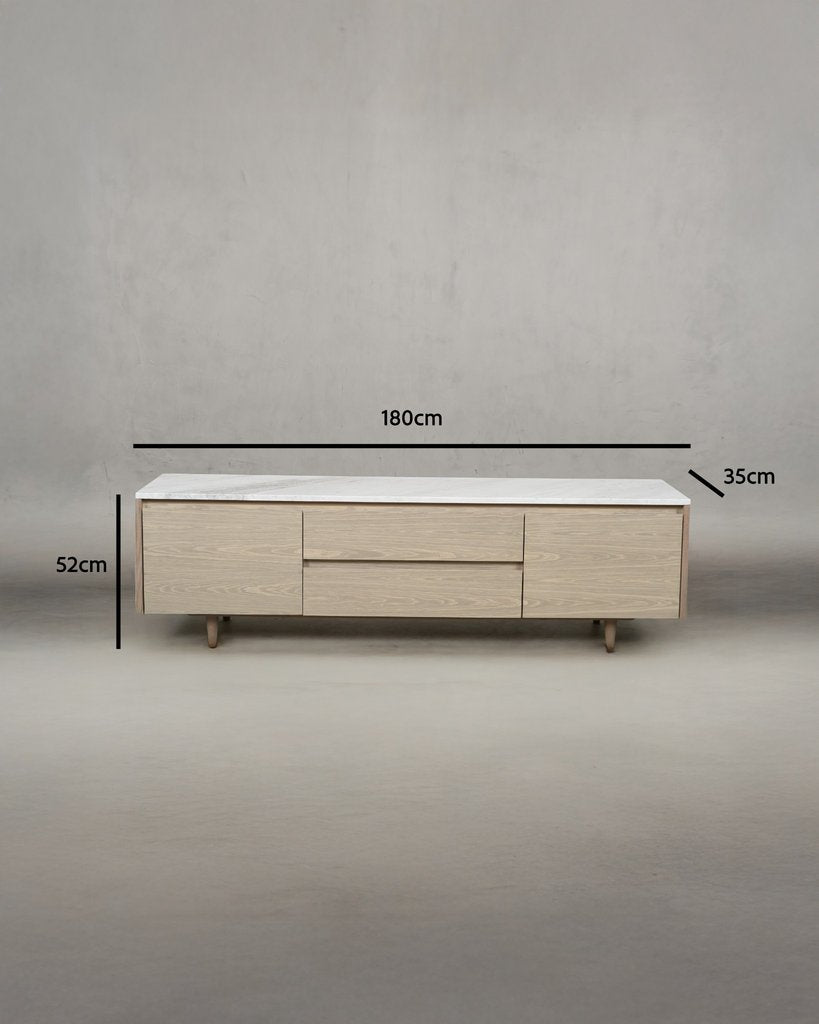 Measuring 180 cm (L) × 40 cm (W) × 50 cm (H), the Alvero TV Unit provides a spacious surface for large televisions and décor, while multiple compartments and drawers offer concealed storage for media devices, remotes, and accessories—keeping your space clutter-free.