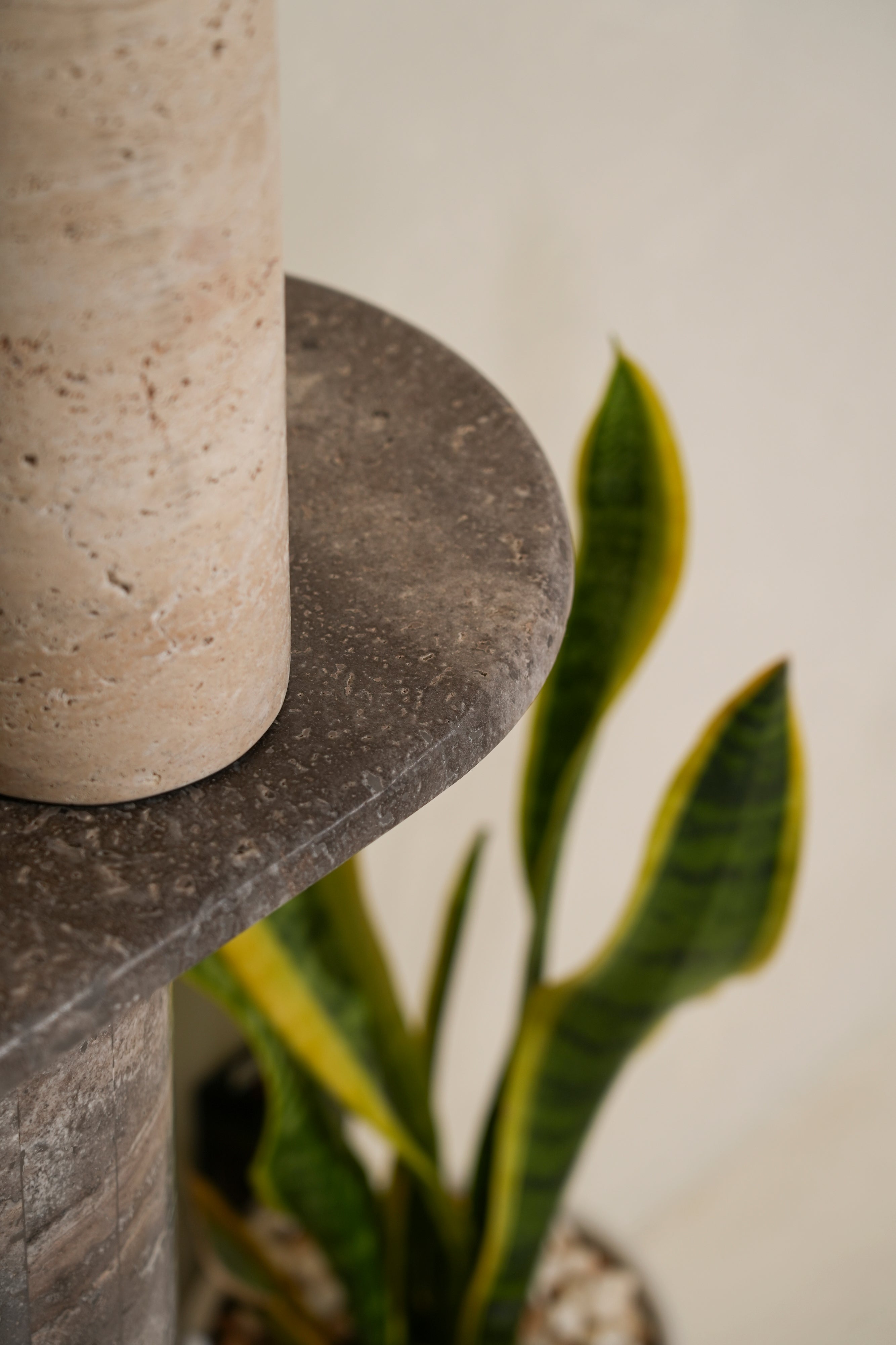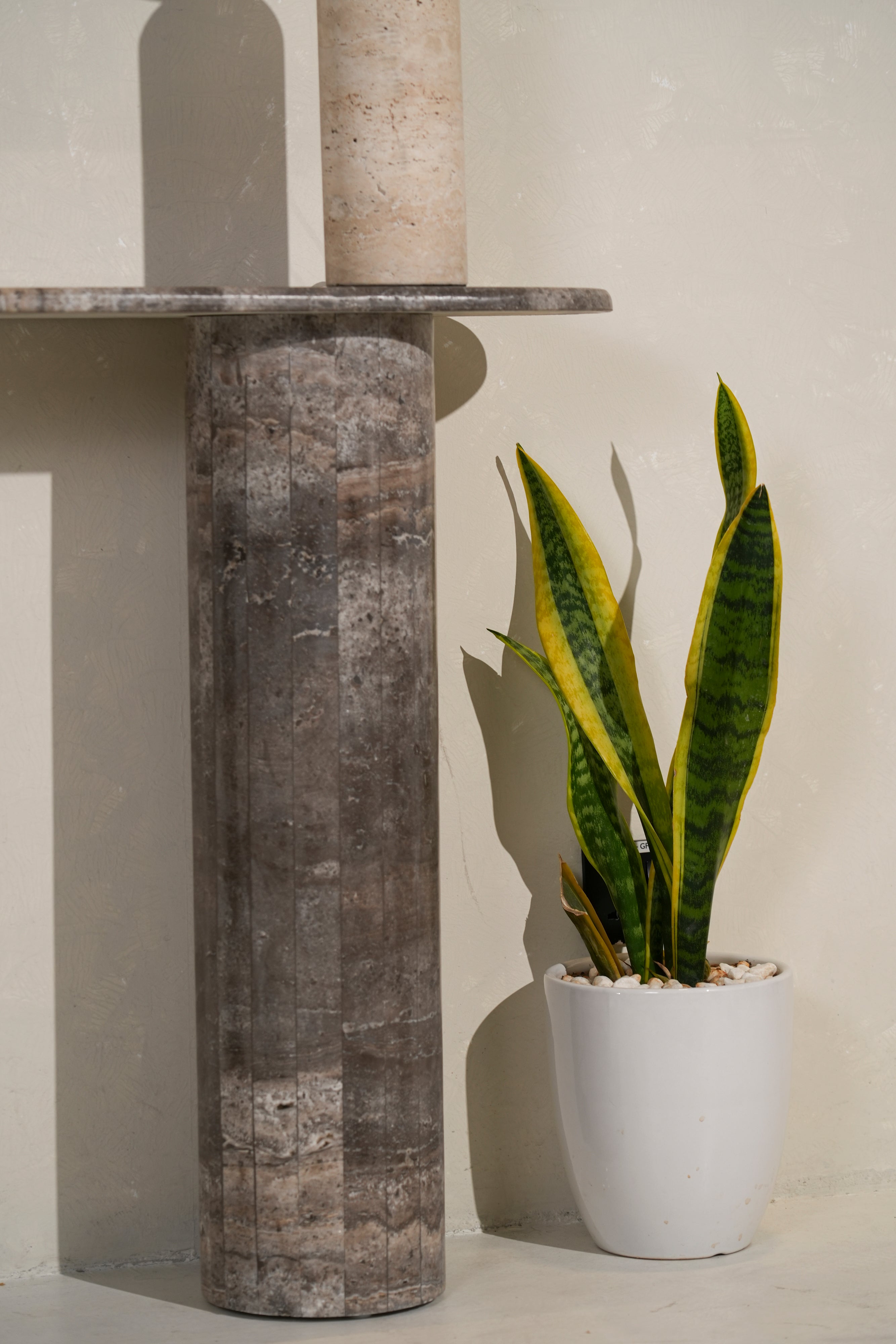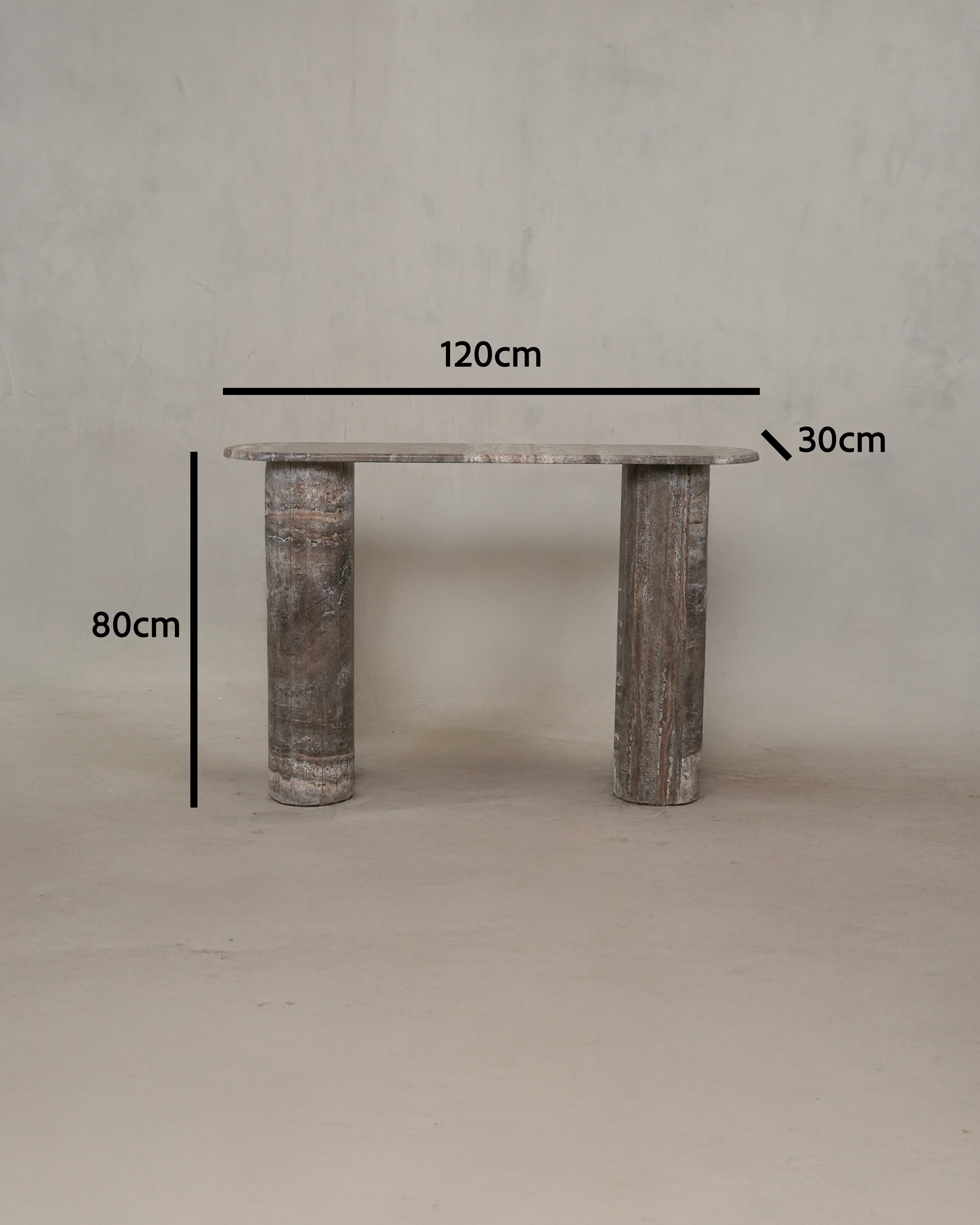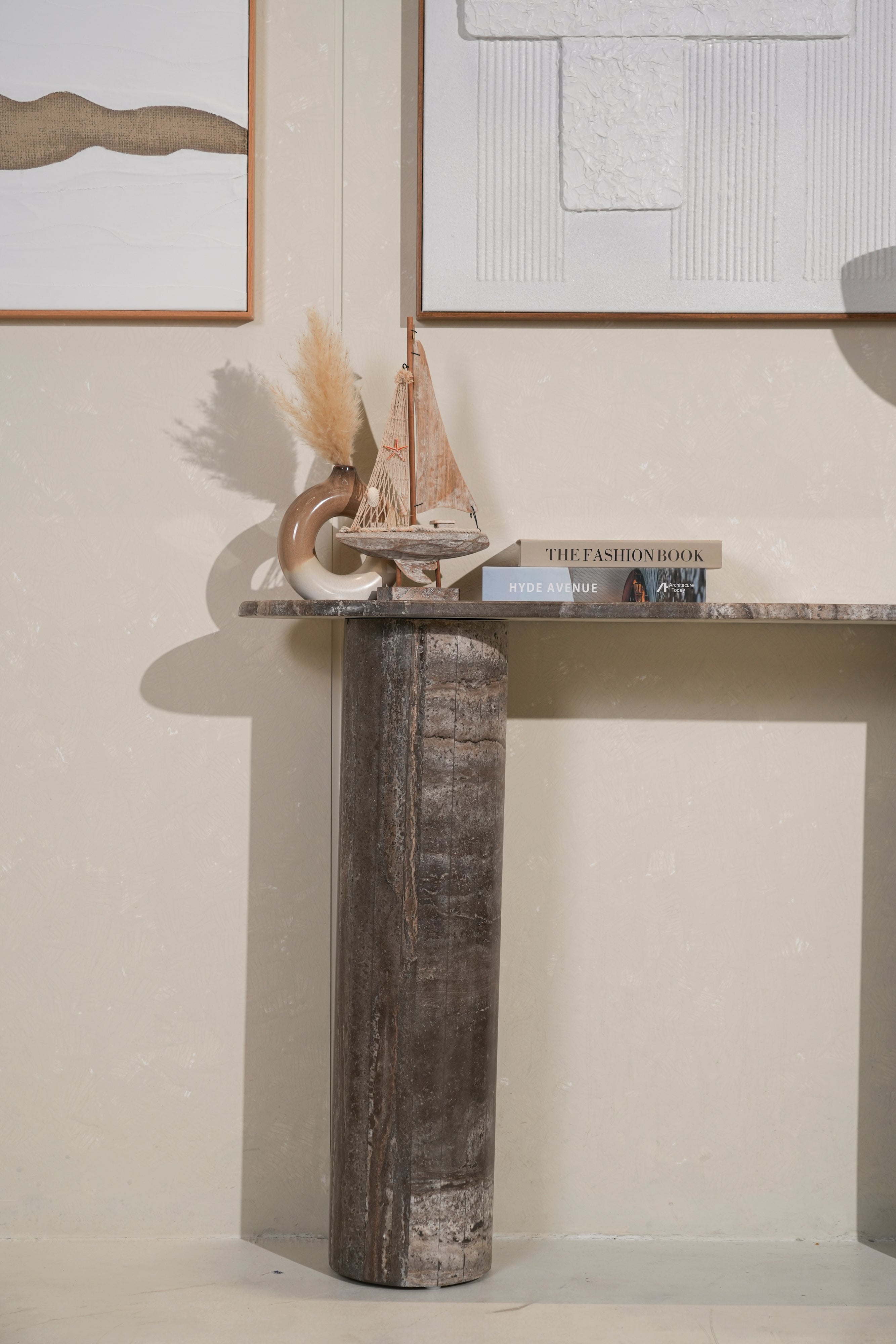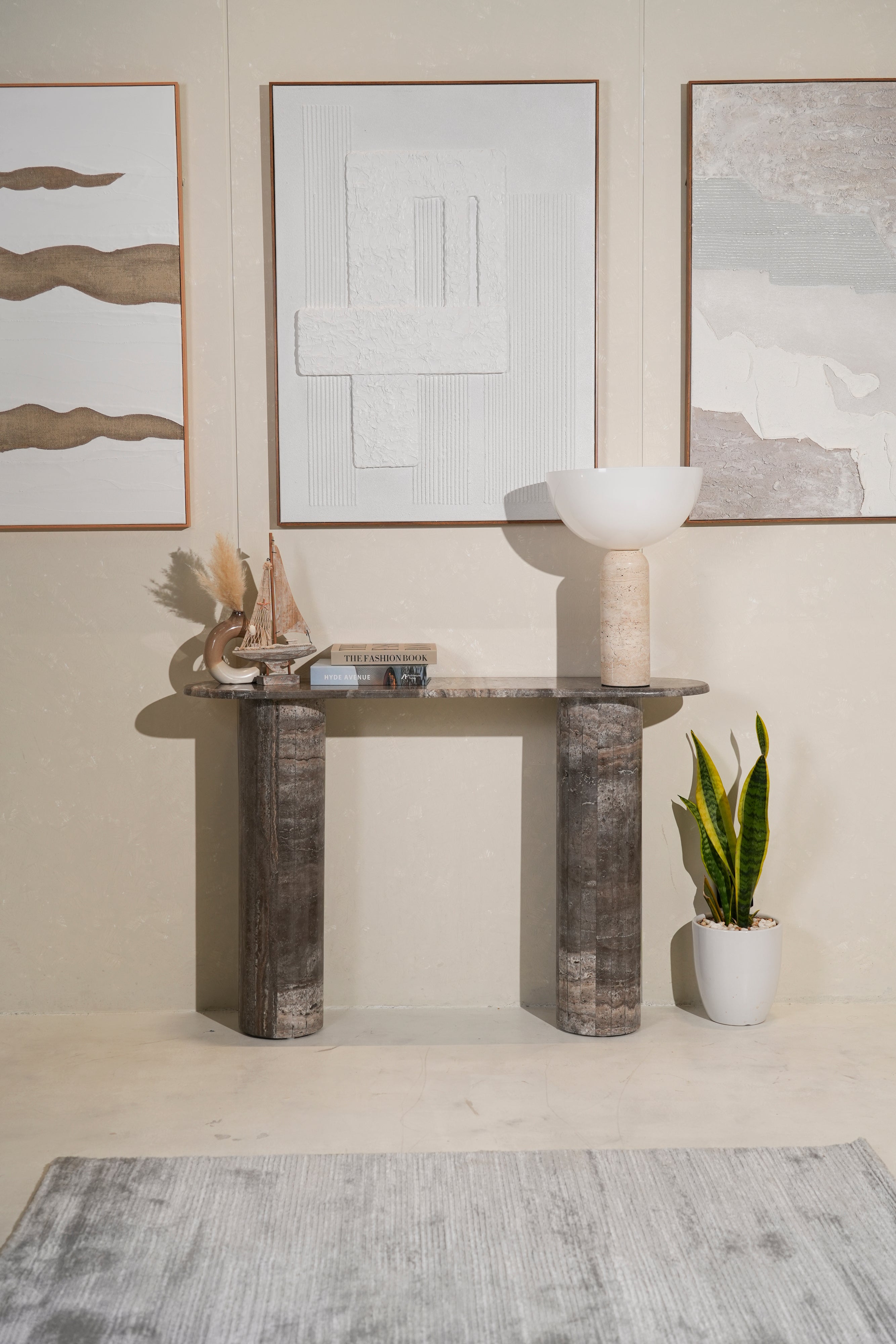 Measuring 120 × 30 × 80 cm, the Argenta Console is perfectly sized for displaying décor, art pieces, or daily essentials. The rounded top and cylindrical column legs give it a modern architectural edge, while the earthy silver tones of the travertine create a warm yet elegant presence.