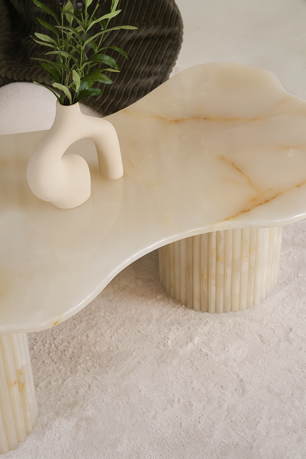 The Aris Coffee Table is designed as a sophisticated centerpiece that elevates any living room with its natural elegance. Crafted from luminous white onyx, the tabletop displays delicate veining and soft tonal variations that make each piece entirely unique. Resting on dual fluted cylindrical bases, the design combines sculptural artistry with enduring strength. At L120 × W60 × H35 cm, it offers a perfect balance of functionality and refined beauty.