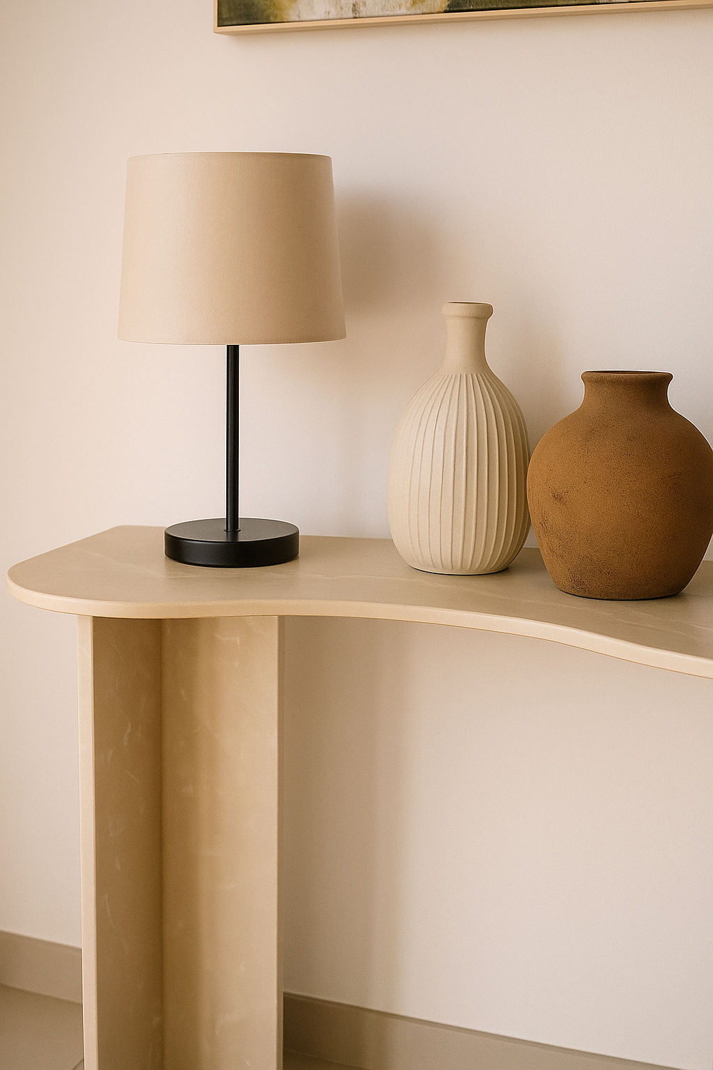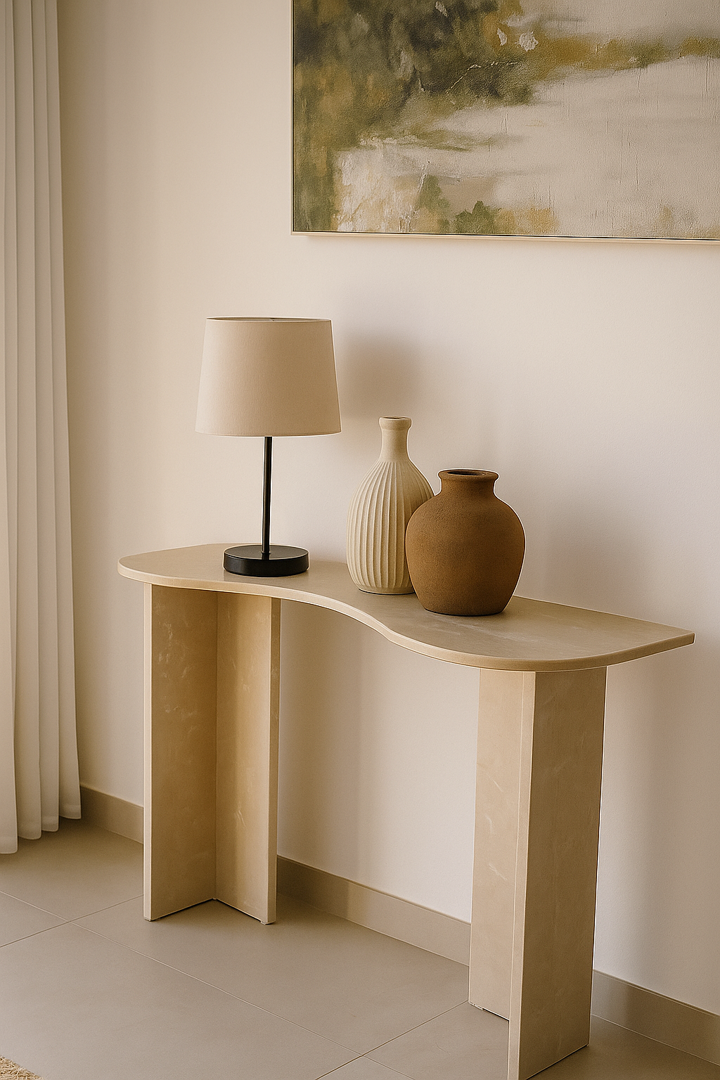 The Favira Console is a refined statement piece crafted from luxurious Crema marble. Its soft beige tones and unique flowing silhouette add warmth and sophistication to any space. Perfectly balanced between minimalism and artistry, this console serves as both a functional surface and a striking decorative element for entryways, living rooms, or hallways.