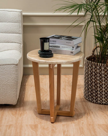 The Liva Marble Side Table combines natural stone elegance with a refined wooden base for a timeless accent piece. Its circular travertine marble top, with warm tones and delicate veining, brings organic character and sophistication to any space. Supported by a sturdy wooden frame with clean lines, it offers balance between natural charm and functional design. At D45 × H52 cm, it is perfectly sized for use beside a sofa, lounge chair, or as a decorative focal point.