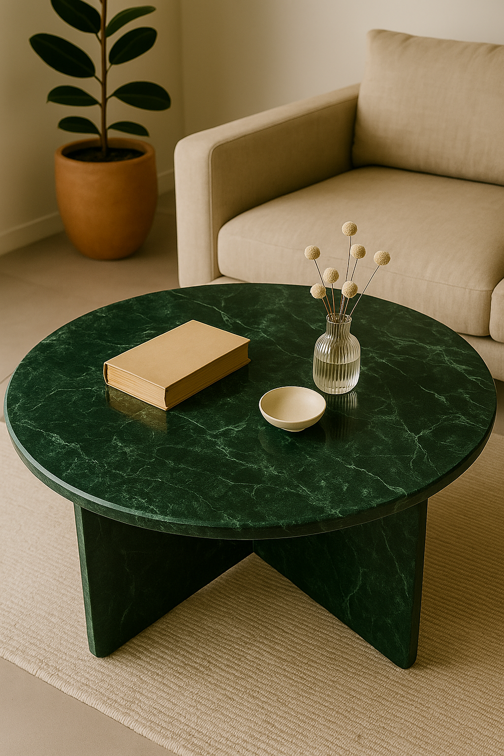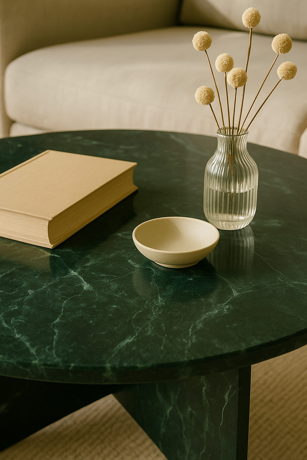 The Ovaro Coffee Table embodies timeless elegance with its deep green marble top, enriched by natural white veining that makes each piece unique. Its bold circular design paired with a sculptural base creates a striking focal point, blending luxury and modern artistry. Perfect for elevating your living space, this table is both functional and a true statement of refined taste.